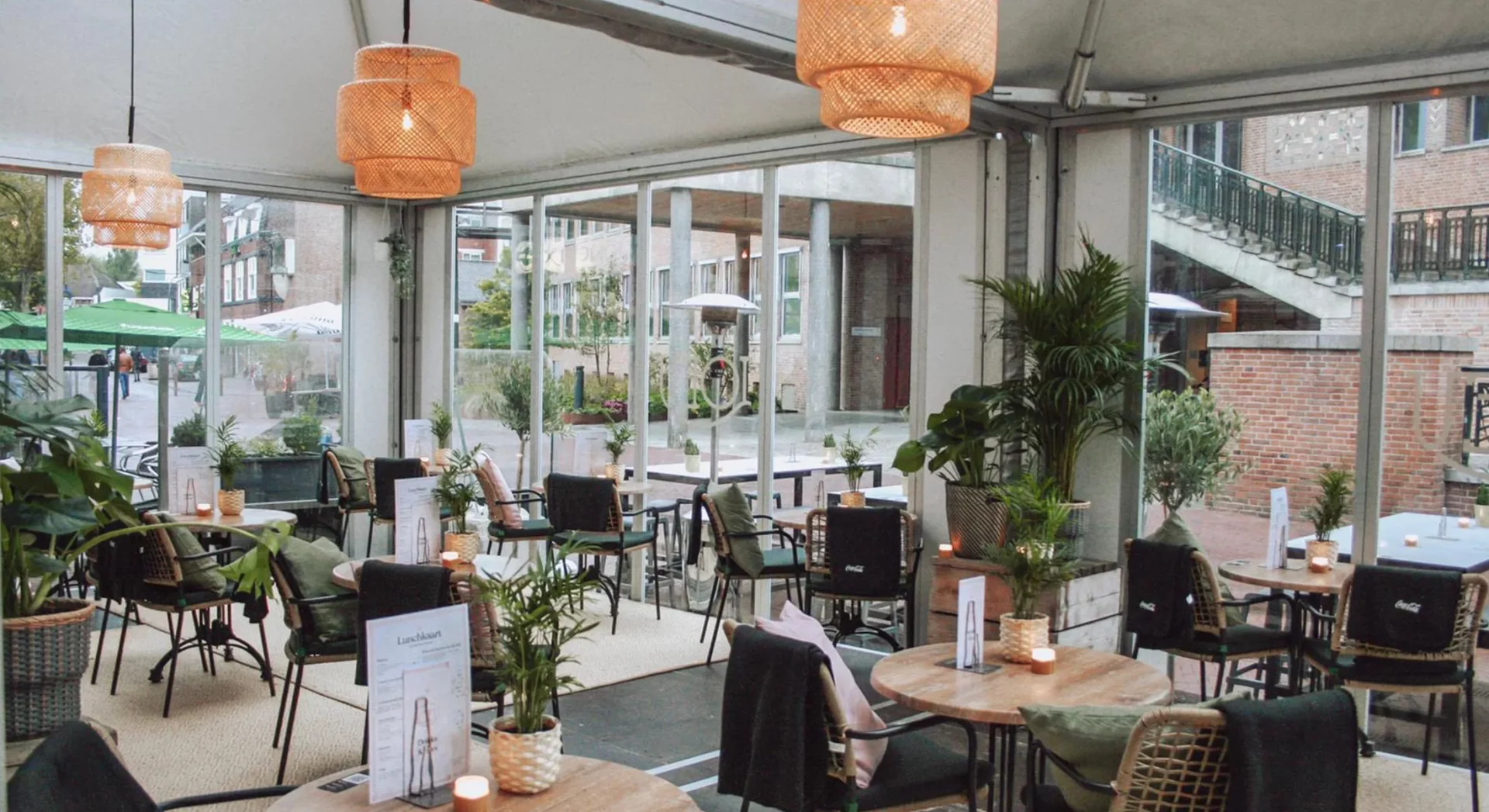 - Een horeca accommodatie met glaspanelen aan het vaste pand als sfeervolle tijdelijke extra ruimte;